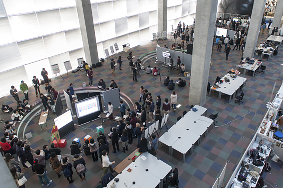7月10日、午後3時。3F正面玄関から真っ直ぐに延びる「モール」と呼ばれるメインストリートで、学生たちのプレゼンテーションが一斉に始まりました。1Fのオープンな空間「スタジオ」でプレゼンを行っているチームもあります。このプレゼンは、プロジェクト学習の中間発表で、4月から取り組んでいる研究テーマの進行状況を伝えるもの。発表する学生たちの熱弁、真剣な眼差しで聞き入る学生たち。ユニークな学習の現場は、授業というよりはライブ感たっぷりの“学びの祝祭”のようでもあり、その熱気に思わず引き込まれてしまいました。