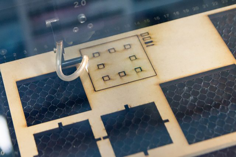 取材当日、工房を利用していた情報デザインコース4年の伊藤汰地さんは、レーザー加工機を使ってMDF(中密度繊維板)を切り出す作業をしていました。使いやすいスイッチの研究で、操作する感覚と心に浮かぶイメージとの関連を調べる実験をするため、押し心地を変化させたいくつかのボタン型スイッチを試作しているそうです。
