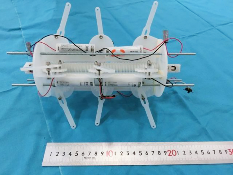 三上: 最初のプロトタイプは、すべてアクリル板で作成しました。2次元CADで作った図面から工房のレーザー加工機でギア・脚・胴体・スペーサを切り出して、ボルトナットで組み立てました。現在のプロトタイプは2次元CADと3次元CADを使っています。脚と平歯車、脚を載せるプレート等はアクリル板をレーザー加工機で切り出し、中心のウォームギアおよびモーターのケースは研究室所有の3Dプリンタを使って作成しています。