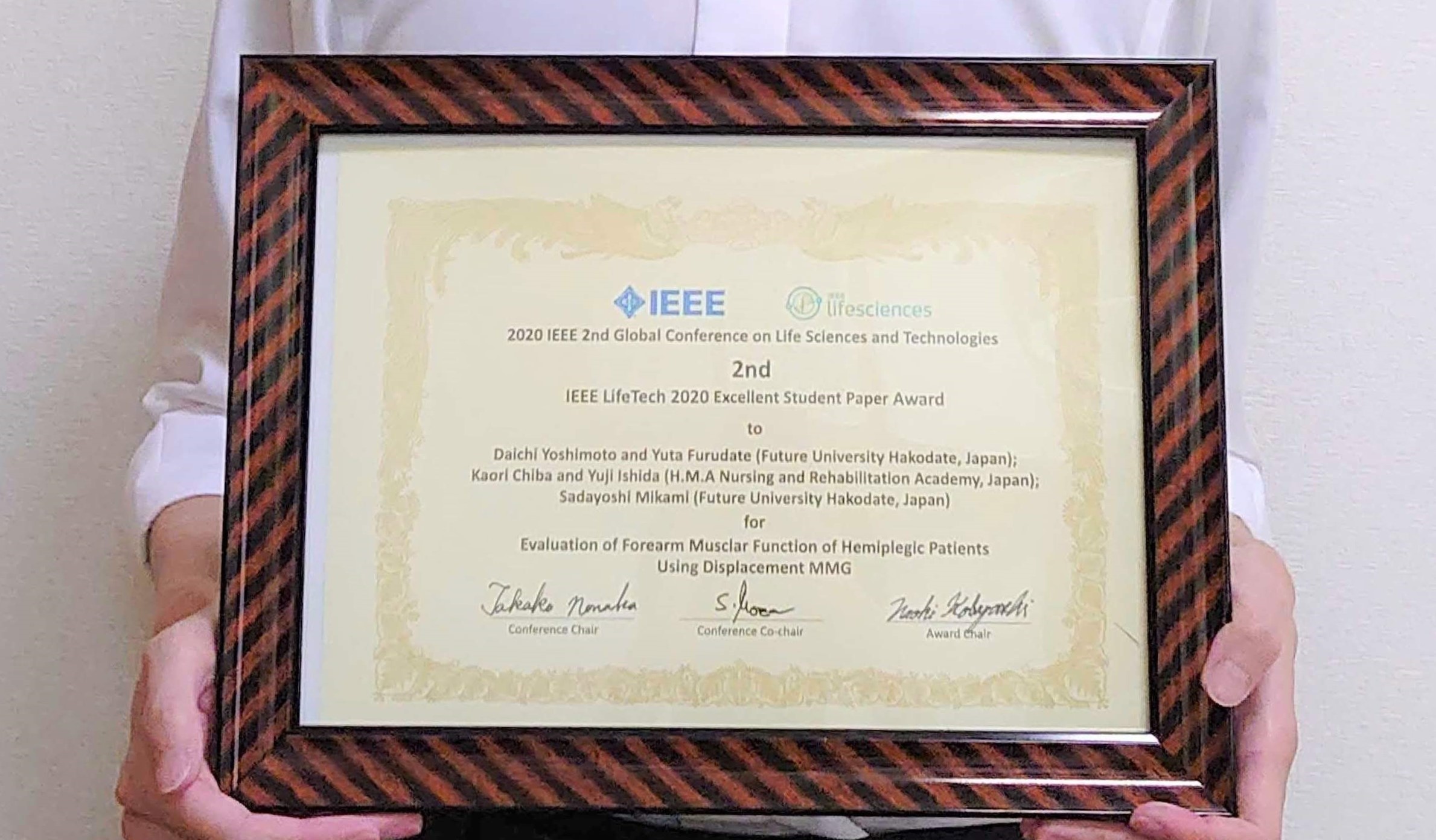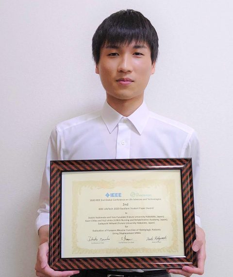Conference on Life Sciences and Technologies)にて、第一著者の好本大地さん(知能情報科学領域博士前期課程2年)および連名者の古館裕大君(博士後期課程3年)(指導教員:三上貞芳教授)が、片麻痺患者のリハビリテーションにおける回復度の自動評価に関する下記の論文で「2nd Prize IEEE LifeTech 2020 Excellent Student Paper Award」を受賞しました。