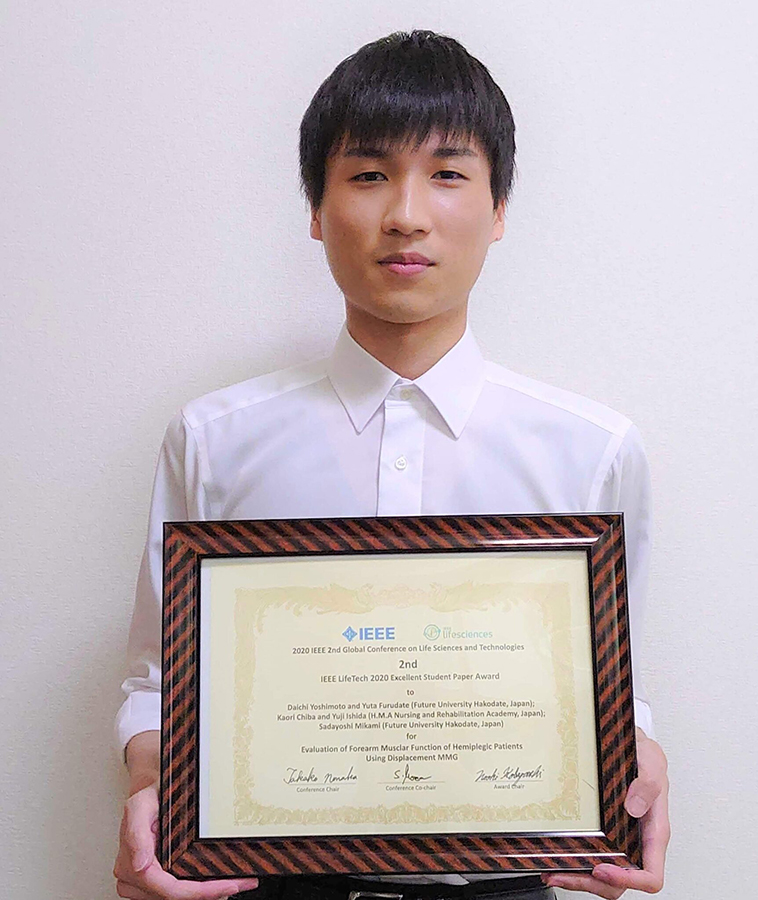 Conference on Life Sciences and Technologies)にて、第一著者の好本 大地さん(知能情報科学領域博士前期課程2年)および連名者の古館 裕大さん(博士後期課程3年)(指導教員:三上 貞芳教授)が、片麻痺患者のリハビリテーションにおける回復度の自動評価に関する下記の論文で「2nd Prize IEEE LifeTech 2020 Excellent Student Paper Award」を受賞しました。