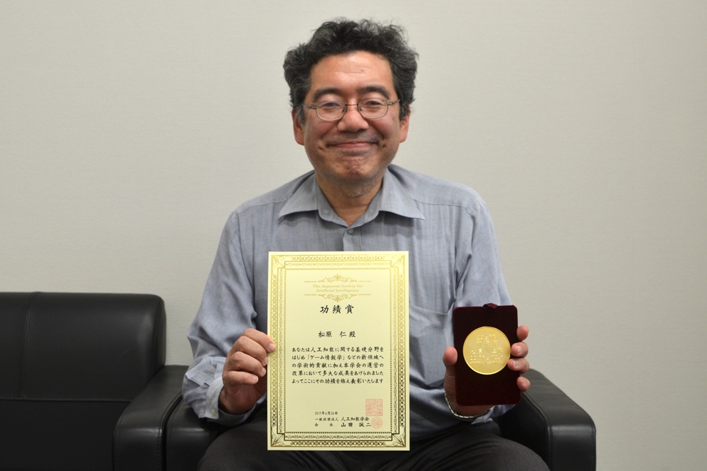 本学の松原仁教授/副理事長が、人工知能学会より2016年度功績賞を受賞しました。人工知能の基礎分野をはじめ、ゲーム情報学などの新領域への学術的貢献や、学会運営の改革における多大な成果などが称えられ、表彰状とメダルが授与されました。松原教授は、2014年6月13日~2016年6月24日の期間、第15代人工知能学会会長を務めています。
