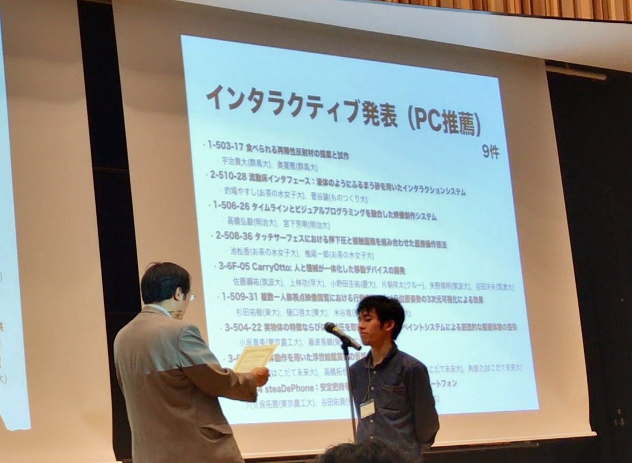 研究成果 2017-03-08 インタラクション2017でインタラクティブ発表賞受賞 関係教員 角 康之 本学博士前期課程1年生の草島将太さんのグループが、2017年3月2~4日に明治大学(東京都中野区)で開催されたインタラクション2017(情報処理学会主催)においてインタラクティブ発表賞を受賞しました。同賞は、 同シンポジウムで発表された204件のインタラクティブ発表の中から、プログラム委員会の論文審査および当日のデモ発表審査を経て9件に与えられたものです。 受賞発表: 草島将太、髙橋拓也、友広歩李、角康之:身体動作を用いた浮世絵鑑賞への仮想参加