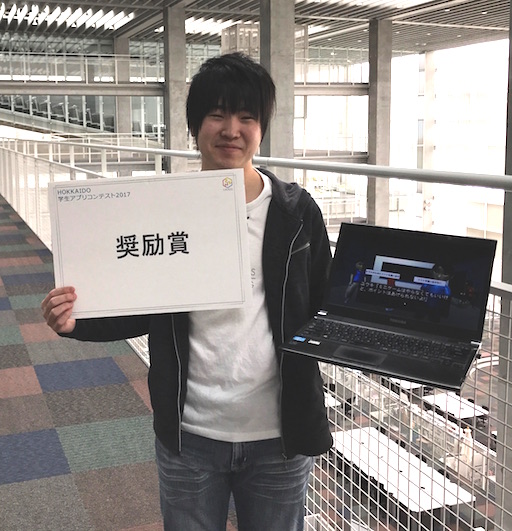 HOKKAIDO学生アプリコンテスト2017は、北海道内の学校に在学している高校生、専門学校生、大学生、大学院生を対象にスマートフォンやタブレット端末上で動作するオリジナルアプリケーションのアイデアを競うコンテストです。応募があった作品の中から9作品が決勝に進出するなかでの受賞です。