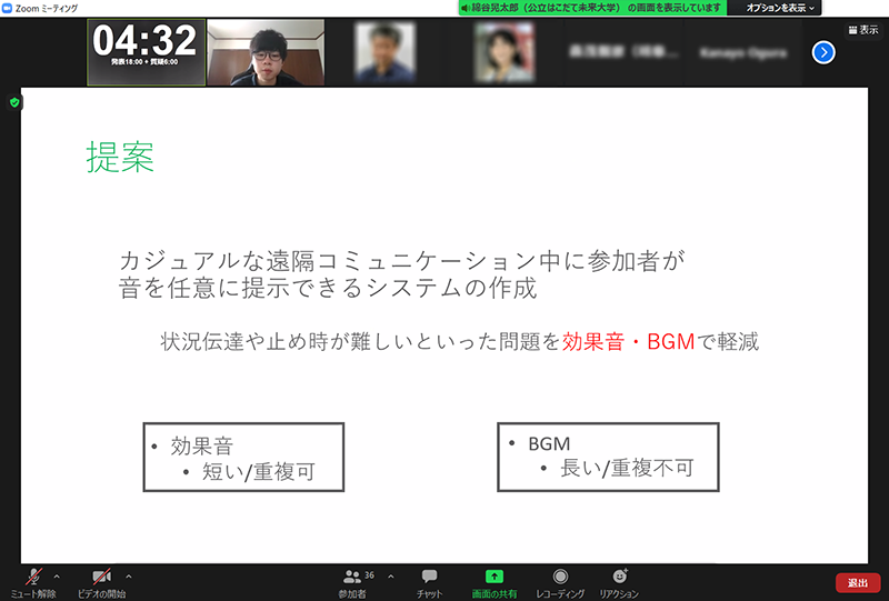 研究成果 2022-01-11 博士(前期)課程1年の綿谷 晃太郎さんが情報処理学会ヒューマンコンピュータインタラクション研究会で学生奨励賞を受賞 関係教員 塚田 浩二 2021年8月23~24日にオンラインで開催された情報処理学会 第194回ヒューマンコンピュータインタラクション(HCI)研究会にて、博士(前期)課程1年の綿谷晃太郎さん(情報アーキテクチャ領域、指導教員: 塚田浩二准教授)が、学生奨励賞を受賞しました。 「綿谷 晃太郎、 塚田 浩二: 音を用いたカジュアルな遠隔コミュニケーションの拡張」 情報処理学会 HCI研究会は、ヒューマンコンピュータインタラクションに関する幅広い発表/議論を行う研究会であり、年間5回程度開催されています。 本研究会では、約20件の発表の中から運営委員による投票により、上位の3件に学生奨励賞が授与されました。