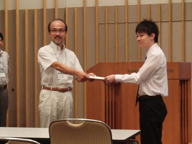 当該コンテストは、日本ロボット学会第30回記念学術講演会に合わせて9月18日に札幌で開催され、ネットワークを活用した新しいロボットサービスの提案を競う15件の応募がありました。最優秀賞1件、優秀賞4件が選出される中で、仲尾君の応募した「ロボットサービスにおける非常時サービス実現のためのサービスサーバの開発」が優秀賞の1つに選ばれました。