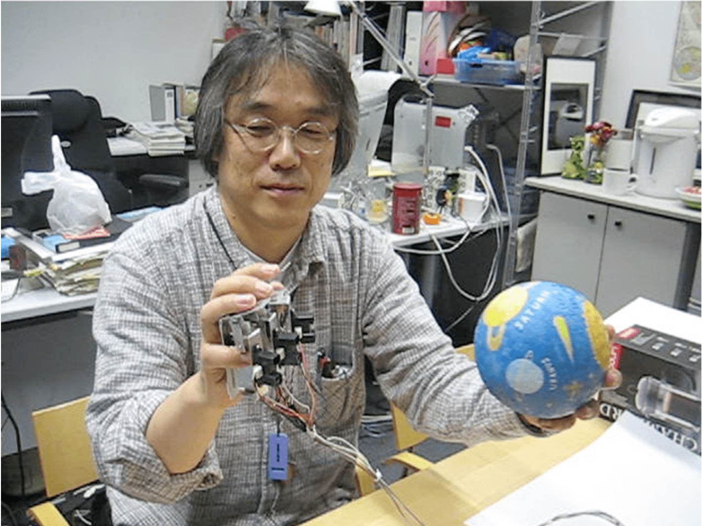 企業では「視覚的」なデザインが中心でしたが、大学着任と同時に新しい研究テーマを探し始め、目の不自由な伊藤精英先生と出会ったことで知覚について興味を深めることになりました。伊藤先生たちと取り組んだ最初のプロジェクト「CyARM」では、小型ロボットで使われるような距離センサやモータを利用し、手に持って環境を非接触に知覚できる装置を開発しました。