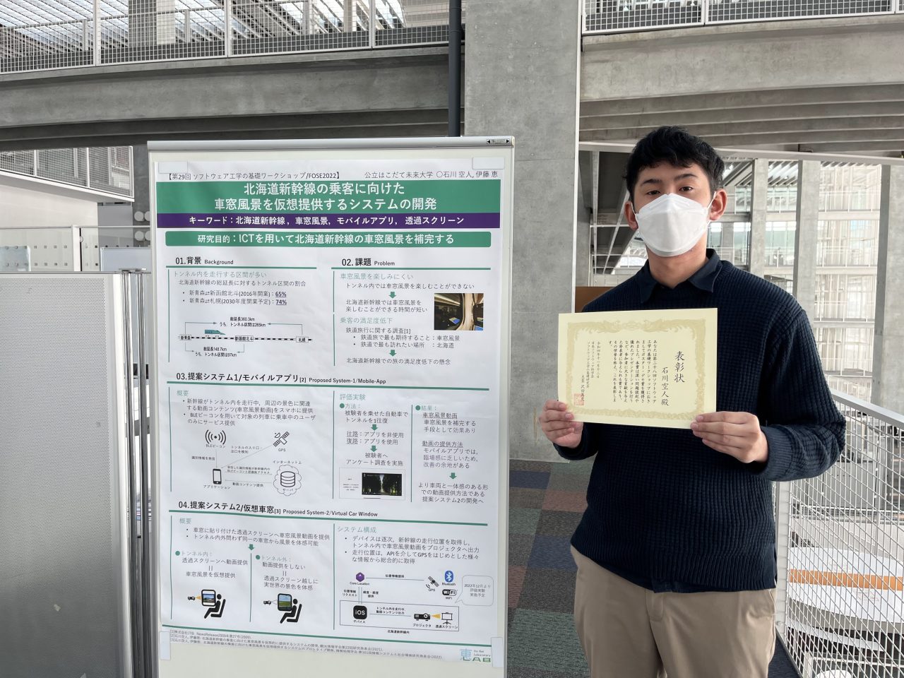 博士(前期)課程2年の石川空人さん(情報アーキテクチャ領域、指導教員:伊藤恵教授)が、2022年11月10日~12日に松江しんじ湖温泉で開催された「第29回ソフトウェア工学の基礎ワークショップFOSE2022」において、下記の発表タイトルで対面およびオンラインでのポスター発表を行い、ポスター・デモ賞を受賞しました。