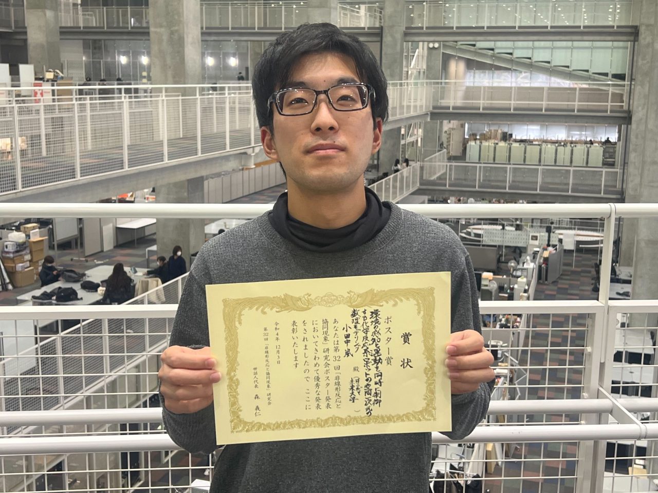 この賞は同研究会において、きわめて優秀なポスター発表を行った学生に贈られるもので、今回は全発表42件の中から3件が選ばれ、その一つが小田中さんの発表となったものです。