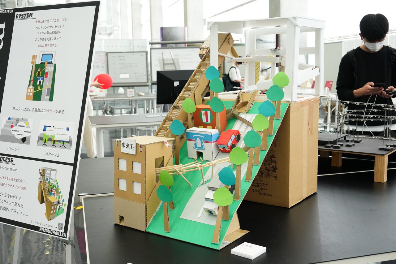 「情報表現基礎II」という授業で、プログラムを組み、センサーを使った制御を取り入れた「動く装置」を創作する課題があり、私たちは「拡張現実ピタゴラ装置meta-fun」を作りました。