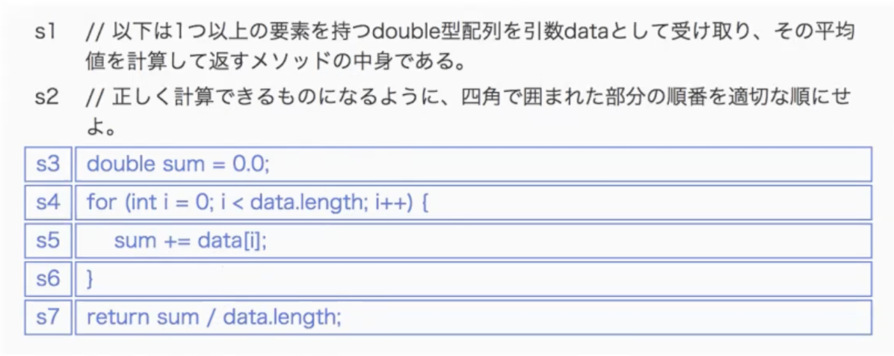 図のような感じで問題文が表示され、その下にJava言語のプログラムの各行がバラバラになって選択肢として表示され、右側の青い枠にドラッグ&ドロップで回答を作成していきます。