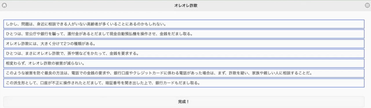 同様に、文章も1文ずつバラバラにして、並べ替えさせました。これはオレオレ詐欺を題材にしたオリジナルの文章です。