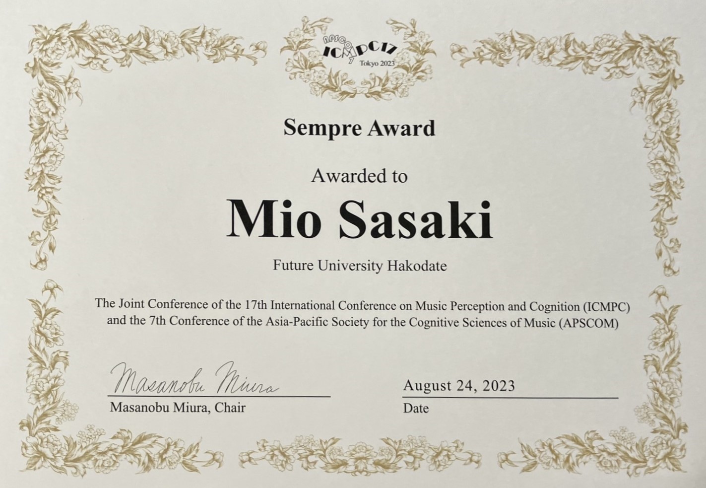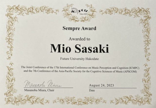 博士(前期)課程2年の佐々木美音さん(メディアデザイン領域)、博士(後期)課程3年能登楓さん、竹川教授および平田教授の論文が、2023年8月24~28日に日本大学江古田キャンパスを会場に開催された音楽知覚認知に関する国際会議The 17th International Conference on Music Perception and Cognition and The 7th Conference of the Aisa-Pacific Society for the Cognitive Sciences of Music(ICMPC17-APSCOM7)においてSempre Awardを受賞しました。