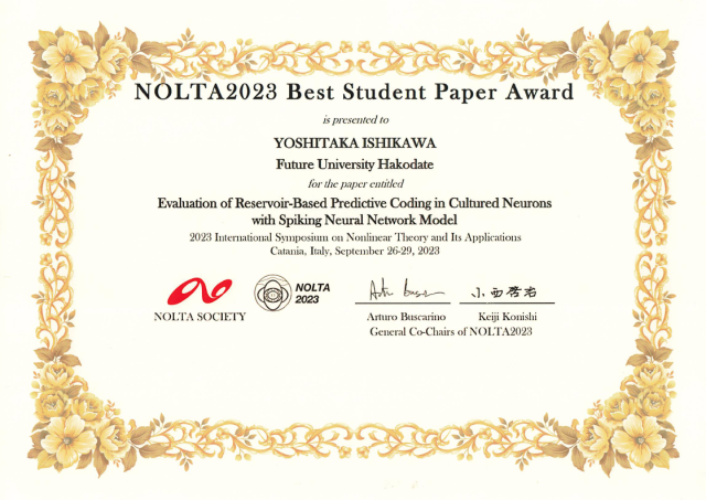 博士(前期)過程1年の石川慶孝さん(複雑系情報科学領域、指導教員:香取勇一教授)が、2023年9月26日から9月29日にかけてイタリアで開催された国際学会NOLTA2023において、培養神経細胞を用いたリザバー計算に基づく予測符号化モデルに関する下記の発表で、“Best Student Paper Award”(最優秀学生論文賞)を受賞しました。
