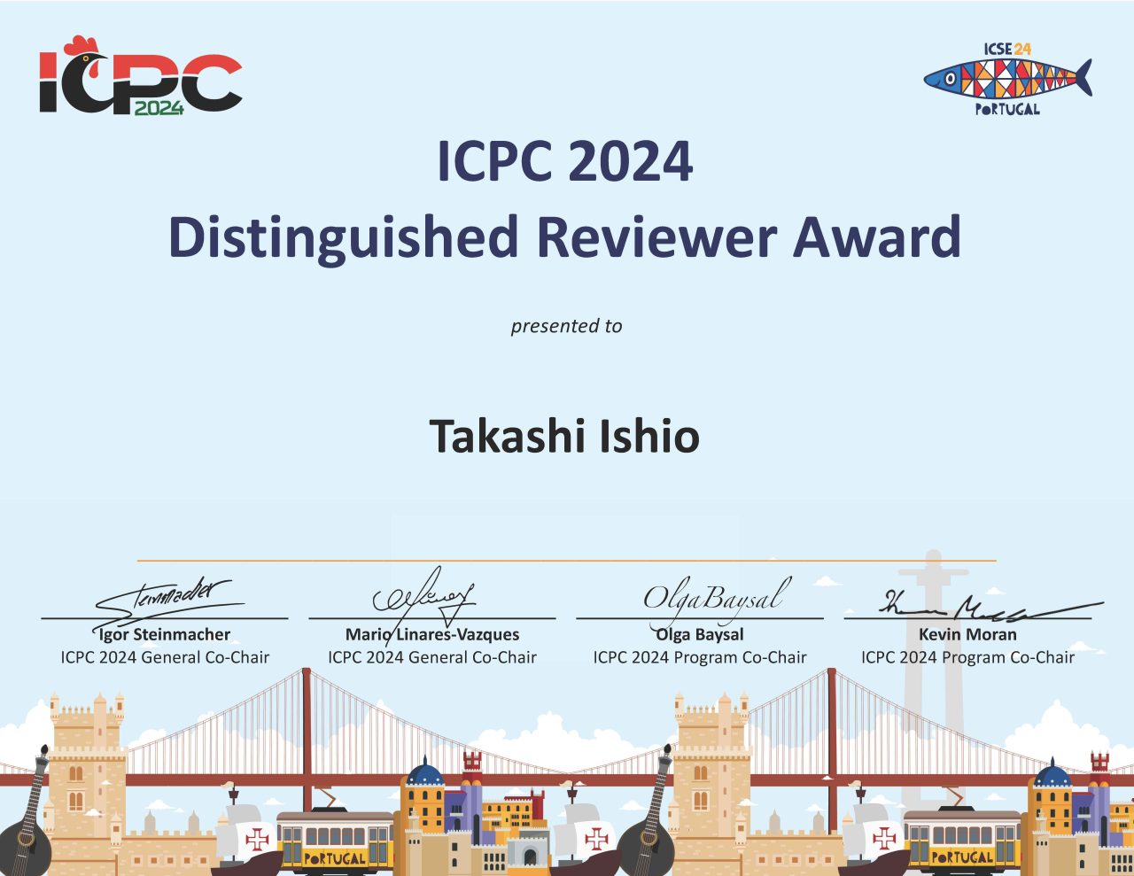 石尾隆教授 (情報アーキテクチャ学科) が国際会議 32nd IEEE/ACM International Conference on Program Comprehension (2024年4月開催) の Distinguished Reviewer Award を受賞しました。