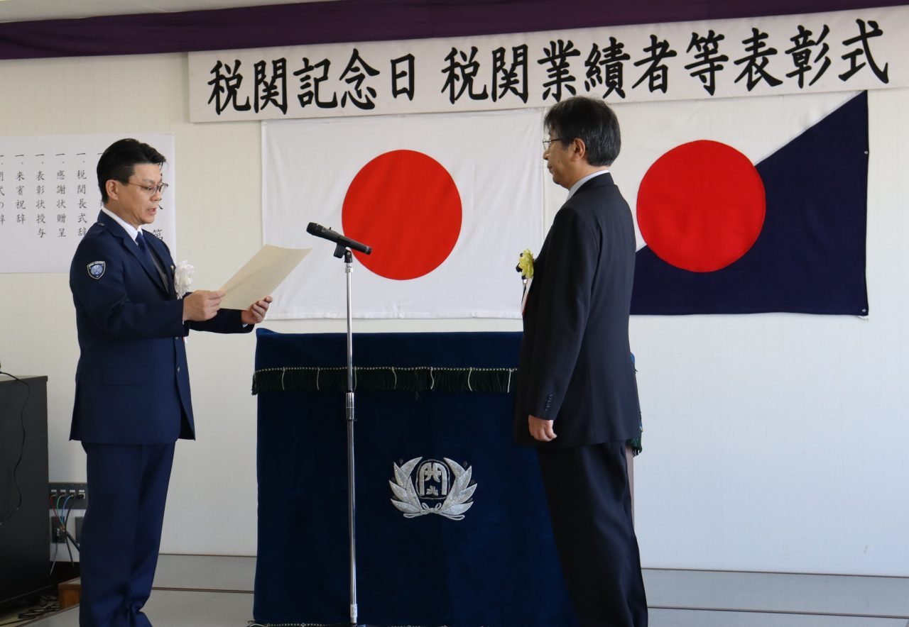 税関記念日にあたる11月28日に函館税関で挙行された税関業績者等表彰式において、後藤秀志 函館税関長から鈴木恵二 理事長に税関行政への協力に対する感謝状が贈呈されました。