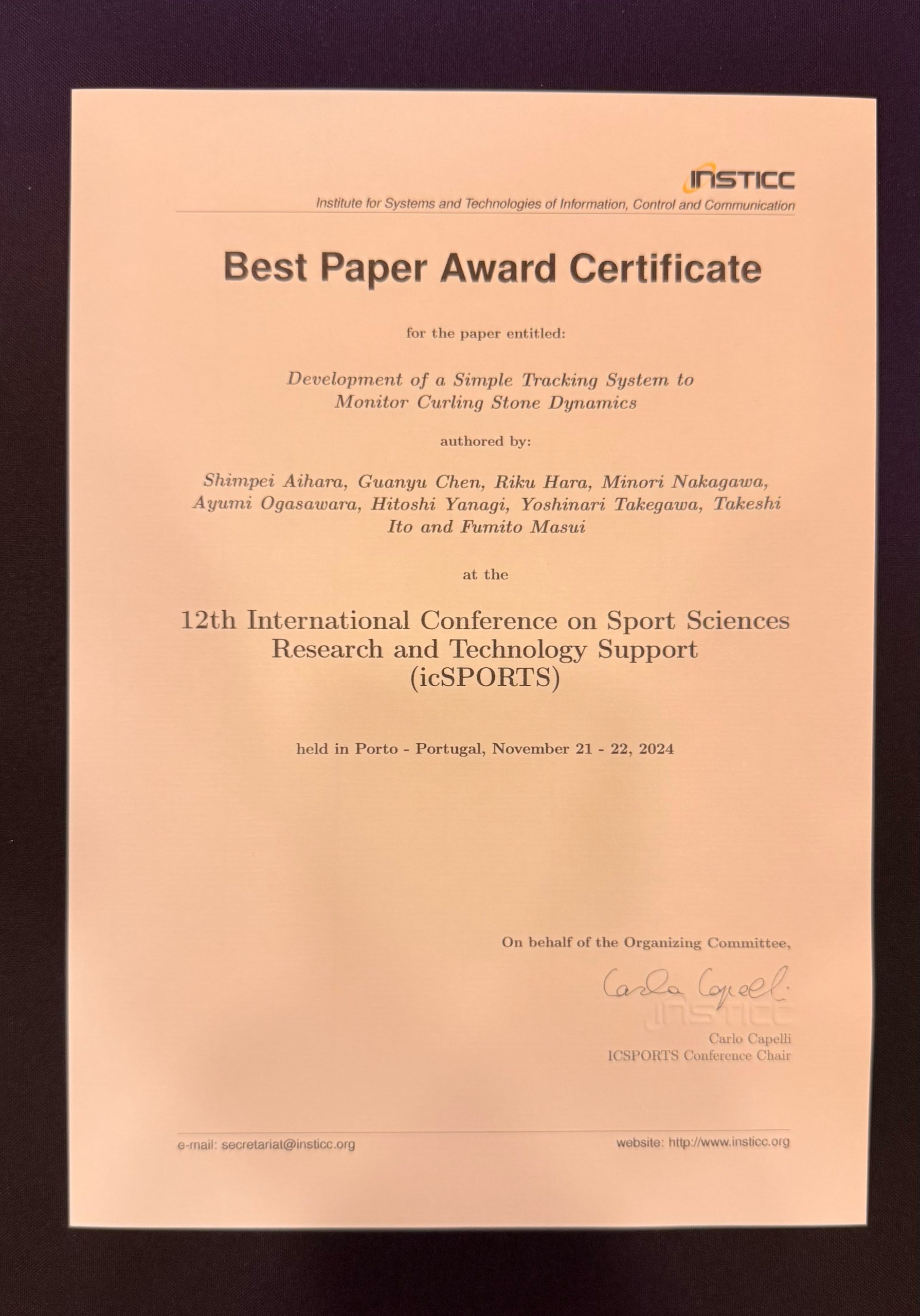 博士(前期)課程2年の陳冠宇さん(情報アーキテクチャ領域、指導教員:竹川佳成教授)、竹川教授(情報アーキテクチャ学科)らの論文が、2024年11月21日~22日にポルト(ポルトガル)で開催された、スポーツテクノロジーに関する国際会議であるicSPORTS 2024においてBest Paper Awardを受賞しました。