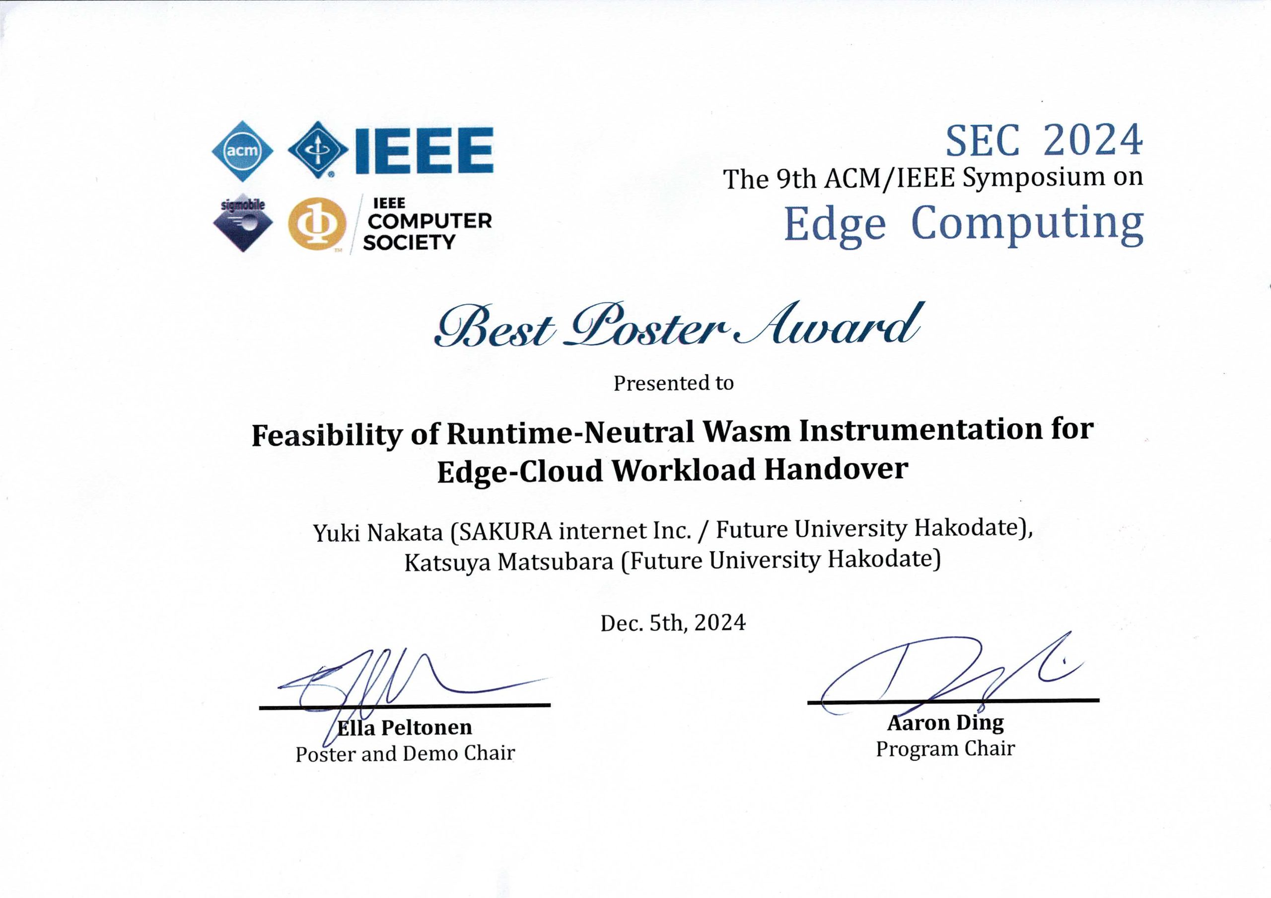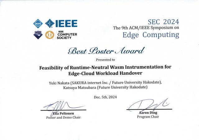 博士(後期)課程1年の中田裕貴さん(指導教員:稲村浩教授)、松原克弥教授(情報アーキテクチャ学科)らのポスター発表が、2024年12月4日〜7日にローマ(イタリア)で開催された、エッジコンピューティングに関する国際会議である9th ACM/IEEE Symposium on Edge Computing(SEC 2024)において、Best Poster Awardを受賞しました。