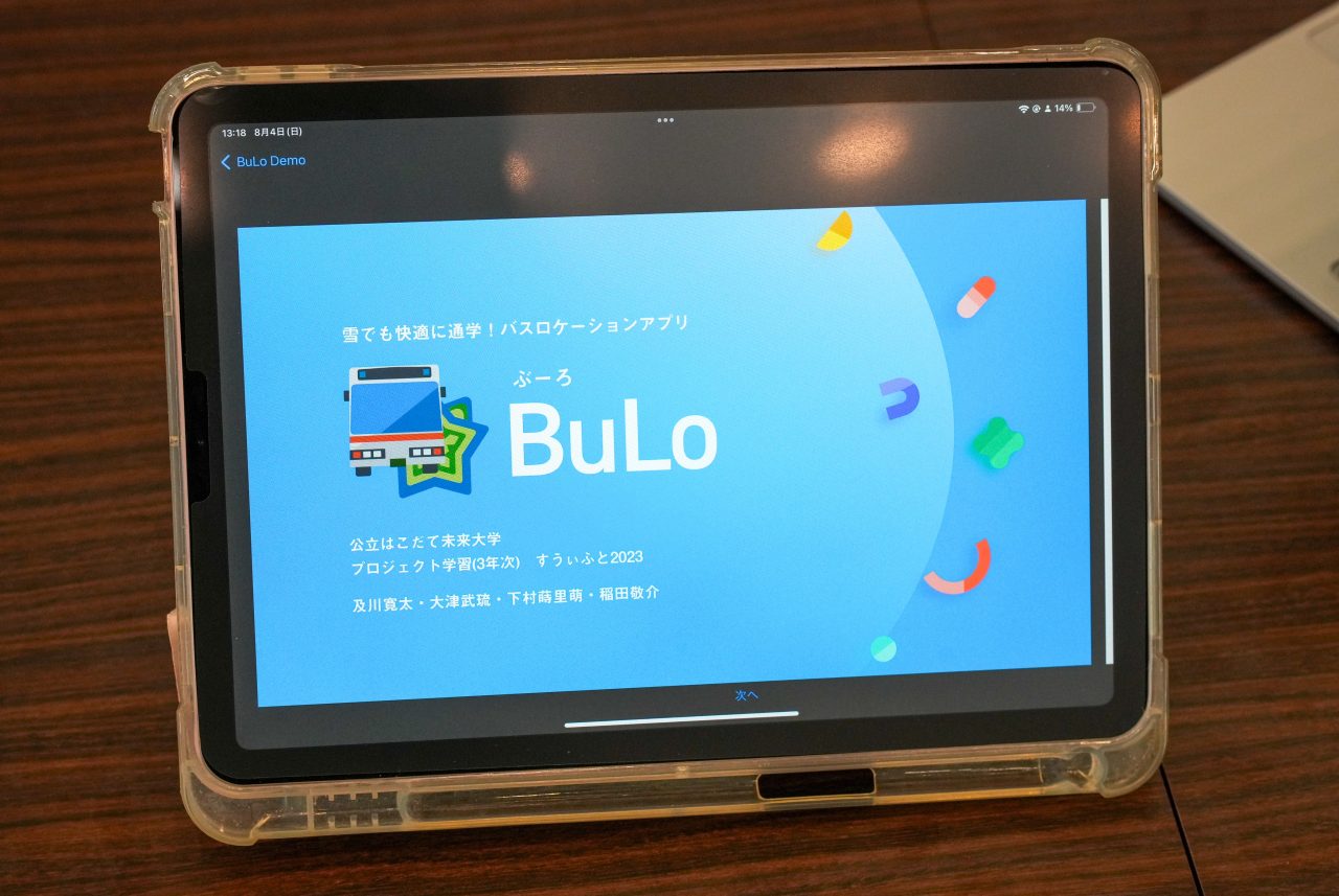 「BuLo」は、プロジェクト学習で開発したアプリケーションです。このアプリでは、あらかじめ自宅と目的地を登録しておくことで、路線バスの一覧や路線図の詳細を表示させることができます。目的地へ急いでいる際も、どのバスに乗れそうかを視覚的にわかりやすく把握することができます。