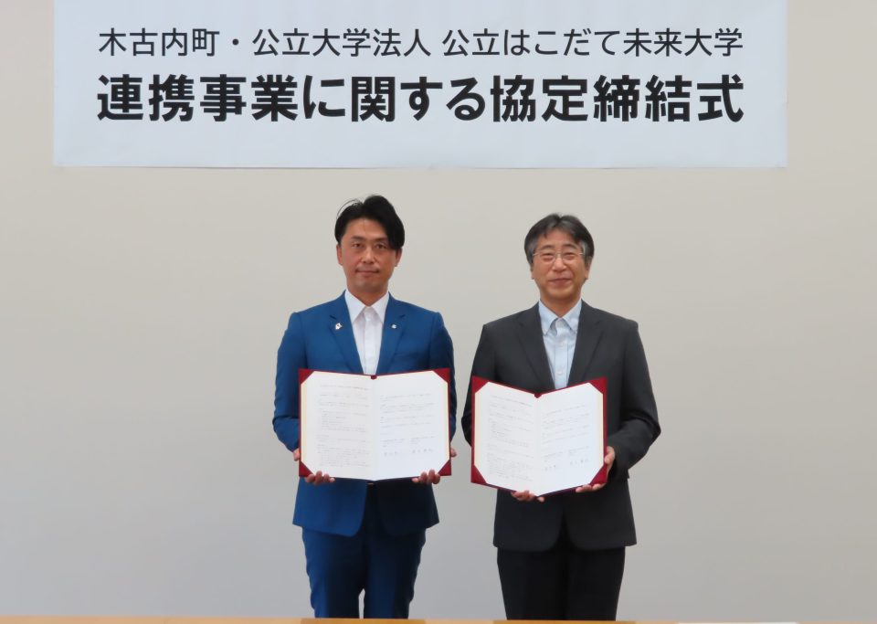 令和7年8月12日、本学と木古内町との連携事業に関する協定の締結式が行われ、本学 鈴木 恵二理事長・学長と鈴木 慎也木古内町長が、協定書へのサインを取り交わし締結いたしました。