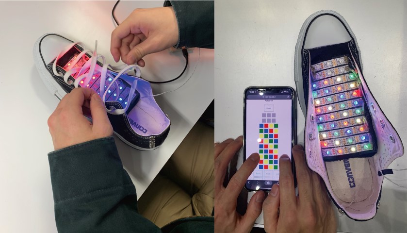 靴紐部分にLEDを用いて、その日の気分や服装に合わせた色や光らせ方をさせることができます。NIKEの電動で靴紐を締めてくれるバスケットシューズのように靴の機能面でテクノロジーが使われ始めていますが、このシステムはファッション性の向上のために制作してみました。