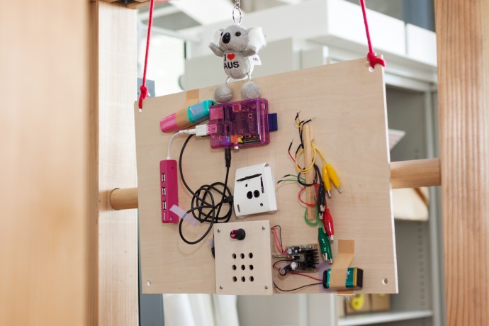 「木の香りが落ち着くので集中して作業したいときは、ボックスにこもります(笑)。杉材は柔らかいので加工しやすいですね。板壁を取り外してホワイトボードを設置したり、机の高さを変えたり、本棚を作ってライトも取り付けるなど、いろいろカスタマイズしています。いま『ラズベリーパイ』という小さなコンピュータを活用できないか、思案中です。電源をとってディスプレイに出力できますし、USBでマウスやキーボードと接続したり、LANポートもついているのでいろいろ工夫できそう。ユニット内にぶらさがっているピンクのキット、あれがラズベリーパイです」