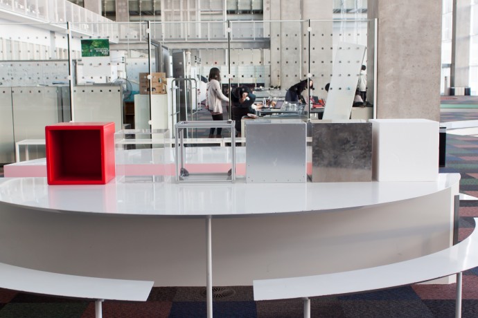 「C&D(Communication and Design)教室をつくる際、学びに必要な環境を学生自らがつくる、そのプロセスも学びのひとつとして位置づけようというのがヒレルさんの考え方でした。通常ですと、スペースがあって、そこに入れる什器をカタログから選んでしまう。未来大の場合は建物といっしょに什器もオリジナルで設計してみよう、と。棚や机や椅子など、モノが先にあって、使い方が限定されるのではなく、使い手がどう使うかを考えられるような什器の開発です。ここにその時の一連の試作品があるのですが、最初は発泡スチロールで、大きさ、重さのイメージをつかみ、次に強度を考えてアルミニウム合金で試作。しかし、金属製だとどうしても重くなってしまう。フレームだけを金属にしたり、アクリルでもつくってみたのですが、強度的に弱い。最終的には木の試作をブラッシュアップしていきました」