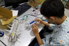 櫻沢: 義手ロボットは、5本の指それぞれにある3つの関節と手首の屈伸、それに回転可能な関節を持った複雑な機構をしています。さらにその内部に、モーター・ギア・マイコン・電子回路・バッテリーを搭載する仕組みです。それを入れるプラスチックフレームを作るために工房の3Dプリンタを使いました。100以上のパーツを製作するため、フル稼働で1週間ほど使用したでしょうか。また、独自で開発した回路の基板を作成するために基板切削加工機を使いました。こちらは1枚加工するために1時間ほどかかり、数回試行錯誤を重ね作成しました。