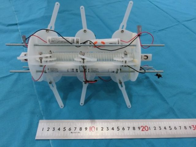 三上: 最初のプロトタイプは、すべてアクリル板で作成しました。2次元CADで作った図面から工房のレーザー加工機でギア・脚・胴体・スペーサを切り出して、ボルトナットで組み立てました。現在のプロトタイプは2次元CADと3次元CADを使っています。脚と平歯車、脚を載せるプレート等はアクリル板をレーザー加工機で切り出し、中心のウォームギアおよびモーターのケースは研究室所有の3Dプリンタを使って作成しています。