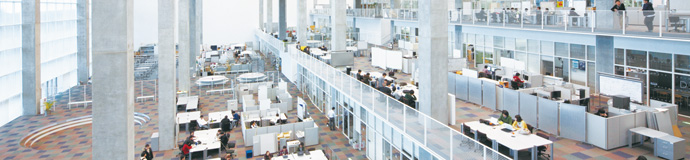5階分を吹き抜けにした象徴的な大空間(スタジオと呼びます)は、そこにいる全員に1つの空間を共有する感覚をもたせ、学びの共同体としての一体感を生み出します。すべての機能がひとつの大きな建物空間の中にレイアウトされ、教員の研究室、講義室、図書館、事務室などの部屋はすべて透明なガラス張りです。誰もがいま学内で何が起こっているのかを、一望のうちに知ることになります。そしてこの空間と一体となったカリキュラムやプログラムのもと、グループワークやディスカッション、プログラミング、デザイン、ものづくり、コミュニケーション、プレゼンテーションなど様々な活動が、あちらこちらで思い思いに繰り広げられます。オープンな空間と、オープンな学びが、公立はこだて未来大学のすべての活動の根源にあります。