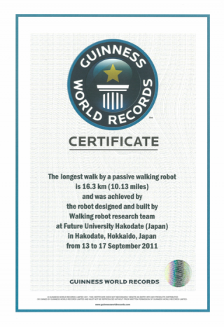 A biped walking robot developed by Professor Sadayoshi Mikami’s laboratory walked continuously on an angled conveyor belt (running machine) for 100 hours without a power source in the Guinness record challenge (the robot should walk without power and only by its own balance and weight shift) and was awarded a Guinness World Record.