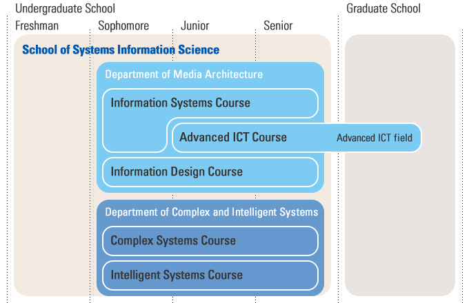 The School of Systems Information Science consists of two departments; the Department of Media Architecture and the Department of Complex and Intelligent Systems. Students are assigned to one of these departments only after their first full year at the University, and additionally choose to belong to a specific course, of which there are five.