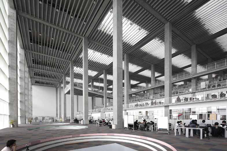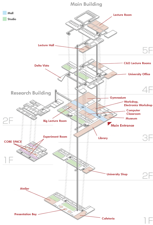 The open space in the main building, “The Studio”, consists of 5 stories of open and glass-walled studying spaces, which enhance a sensation of unity and encourage greater interaction among students and faculty.