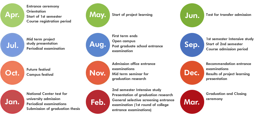 The new term starts in April, the first semester ends in August. The second semester starts in September and the closing ceremony and graduation ceremony are held in March of the following year.