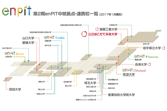 第2期enPiT「成長分野を支える情報技術人材の育成拠点の形成(略称: enPiTエンピット)」は、第1期enPiT「分野・地域を越えた実践的情報教育協働ネットワーク」で構築した知見や産学間のネットワークを活かしつつ、当該分野における運営拠点が互いに連携し、プログラム一体として教育ネットワークを形成し人材育成を推進してきました。今後も学部生を対象とした実践的な教育を継続していきます。