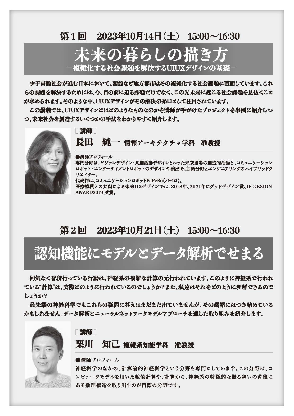 少子高齢社会が進む日本において、函館など地方都市はその複雑化する社会課題に直面しています。これらの課題を解決するためには、今、目の前に迫る課題だけでなく、この先未来に起こる社会課題を見抜くことが求められます。そのような中、UIUXデザインがその解決の糸口として注目されています。この講義では、UIUXデザインとはどのようなものなのかを講師が手がけたプロジェクトを事例に紹介しつつ、未来社会を創造するいくつかの手法をわかりやすく紹介します。