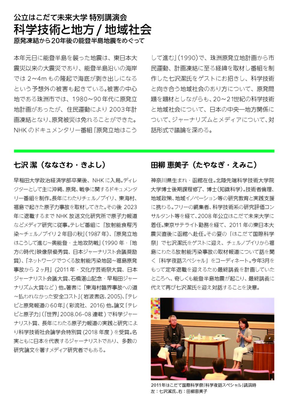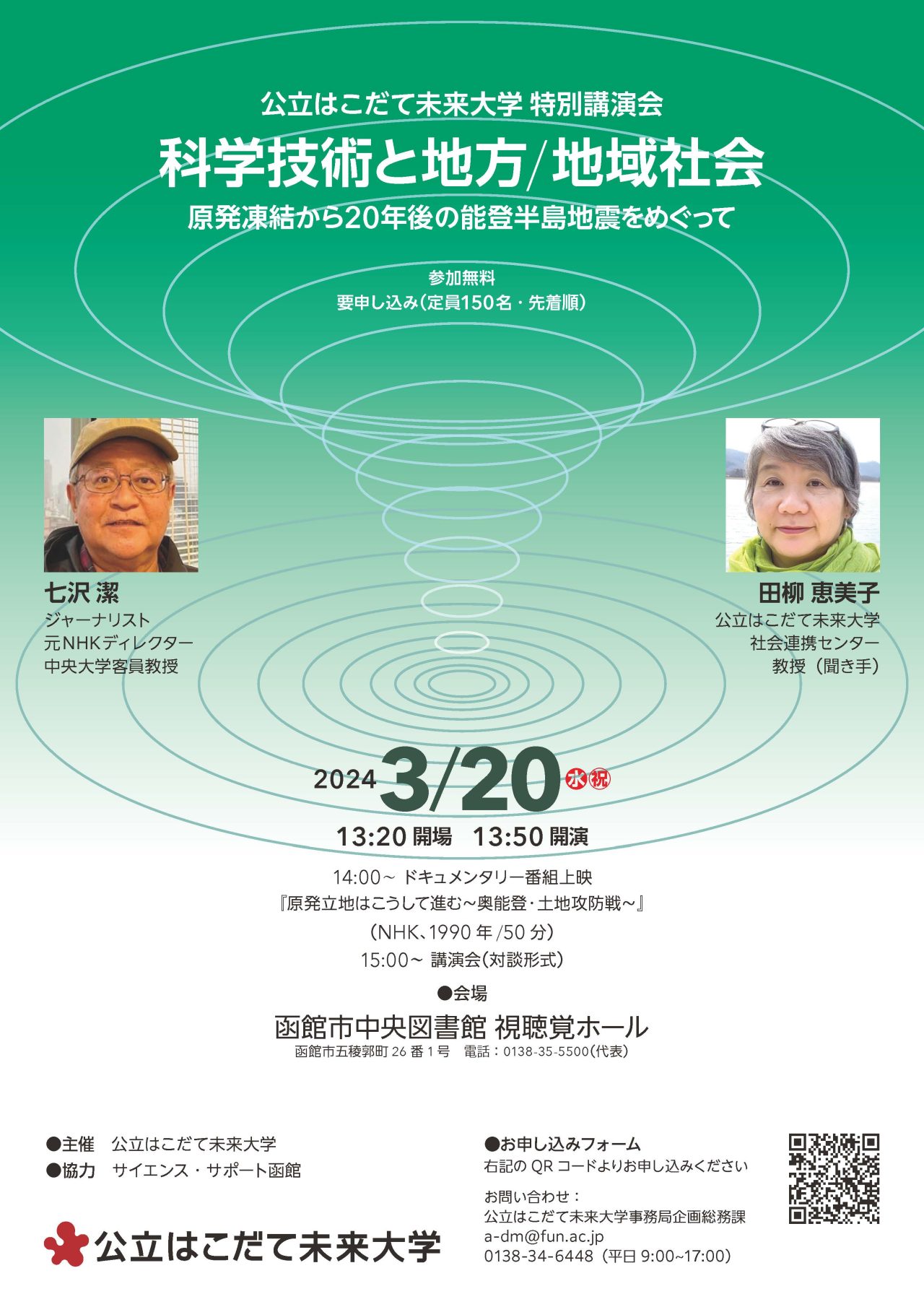神奈川県生まれ・函館在住。北陸先端科学技術大学院大学博士後期課程修了、博士(知識科学)。技術者倫理、地域政策、地域イノベーション等の研究教育と実践支援に携わる。フリーの編集者、科学技術系の研究評価コンサルタント等を経て、2008 年公立はこだて未来大学に着任。東京サテライト勤務を経て、2011 年の東日本大震災直後に函館へ赴任。その夏の「はこだて国際科学祭」で七沢潔氏をゲストに迎え、チェルノブイリから福島にわたる放射能汚染事故の取材報道について話を聞く「科学夜話スペシャル」をコーディネート。今年3月をもって定年退職を迎えるため最終講義を計画していたところへ、奇しくも能登半島地震が起こり、最終講義に代えて再び七沢潔氏を迎え対話することを決意。