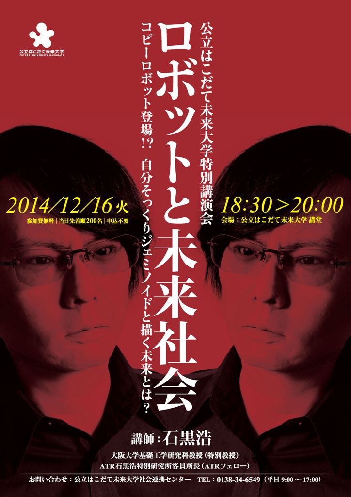講演者の石黒浩さんは、操作者と酷似し、操作者と同期して動くアンドロイド「ジェミノイド」を開発、研究しています。操作者はジェミノイドを自らの体のように感じ、遠隔地においてもジェミノイドの体を使って活動できます。本講演ではジェミノイドをはじめ、大阪大学やATR(国際電気通信基礎技術研究所)で開発された、人と関わる様々なロボットを紹介しながら、近未来に我々がどのようなロボット社会で暮らすかを議論します。