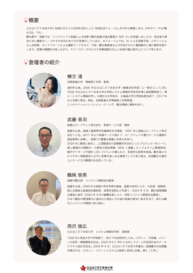 今年のテーマは「観光DX」です。 観光都市・函館では、インバウンドと映画による効果で観光客数が過去最高の600万人を突破しましたが、来訪者の増加に伴い顧客のニーズやその対応のあり方が多様化しています。本フォーラムでは、AIによる混雑予測、ロボットによる人流制御、そしてドローンによる撮影サービスなど、行政・観光事業者および市民の方々に最新動向と導入事例を紹介します。現場の課題を共有しながら、テクノロジーがもたらす体験価値の向上と地域の魅力度向上について考えます。