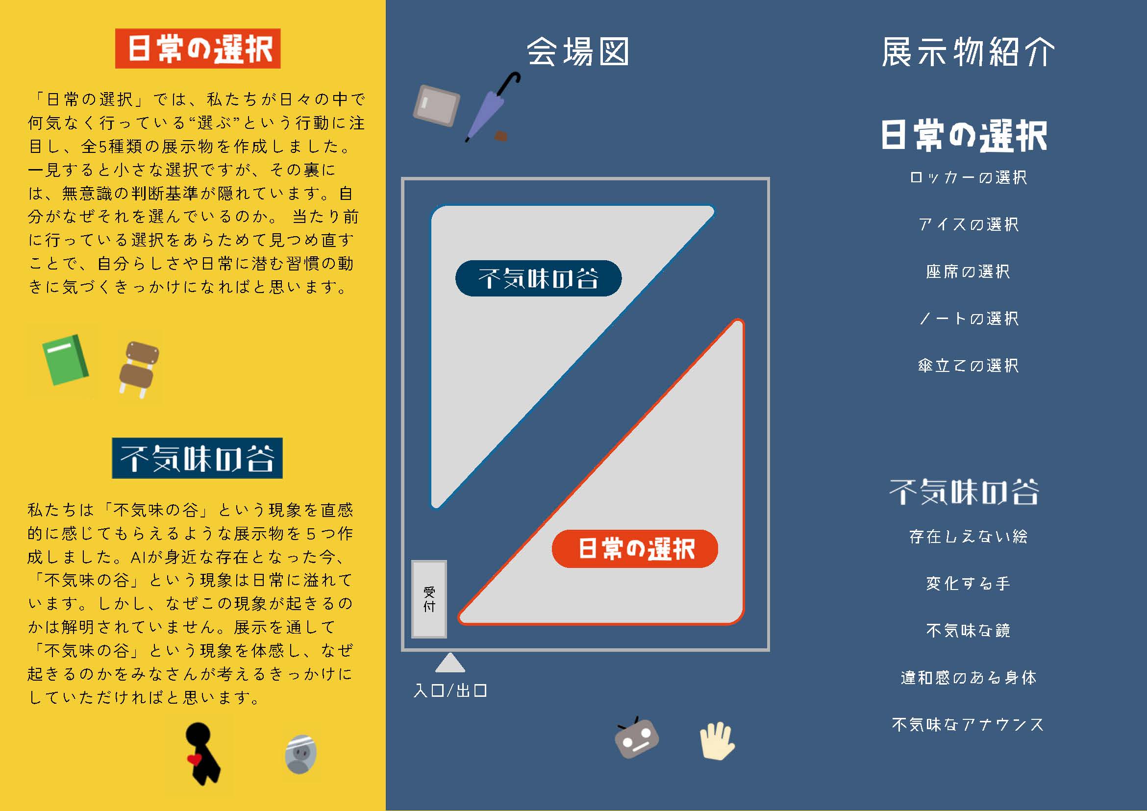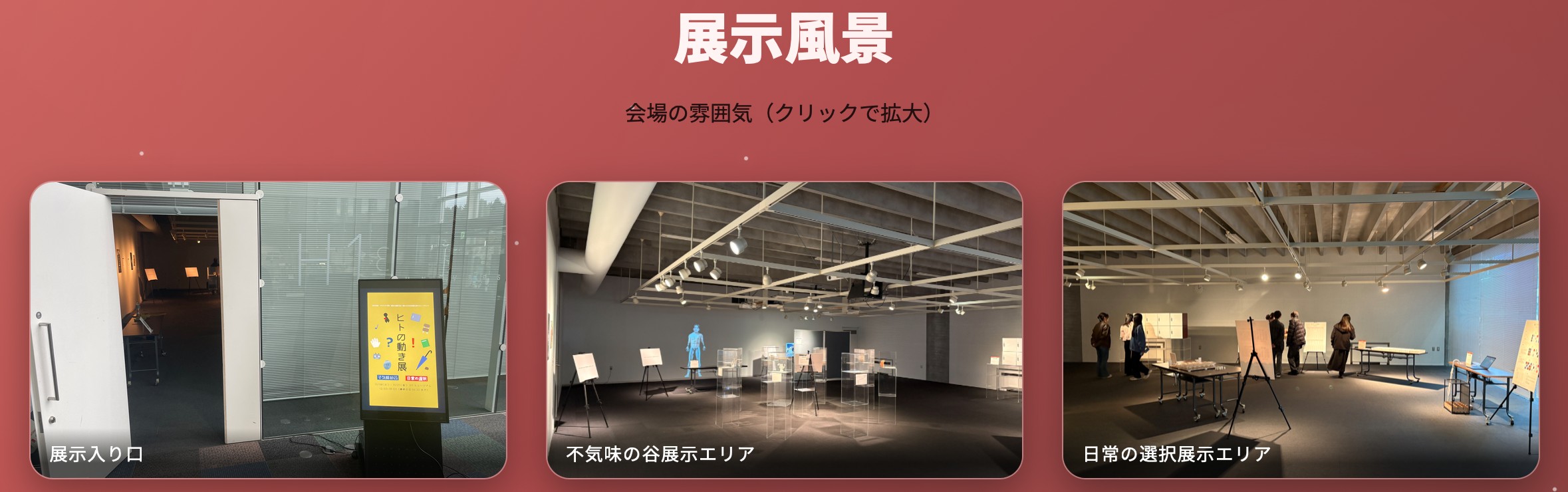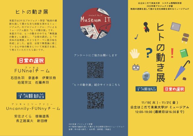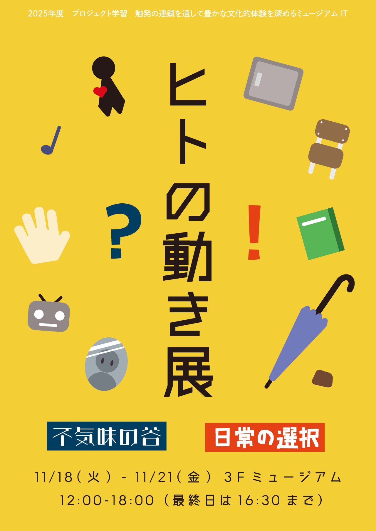 在学生企業・研究者一般の方 2025-11-19 「ヒトの動き展」開催 終了 2025年11月18日 ~ 21日 この度、3年次プロジェクト学習「触発の連鎖を通して豊かな文化的体験を深めるミュージアムIT」のプロジェクトメンバーによるミュージアム展示「ヒトの動き展」を以下のとおり開催いたします。 11月18日(火)12:00-18:00 11月19日(水)12:00-18:00 11月20日(木)12:00-18:00 11月21日(金)12:00-16:30 本展示では、ヒトの動きの中でも「無意識に行っている動き」に着目し、「日常の選択」と「不気味の谷現象」という2つのテーマで展示を制作しました。普段、日常の中で無意識に感じている心や身体の動きについて、本展示を通して考えていただける内容となっています。ふるってご来場ください。