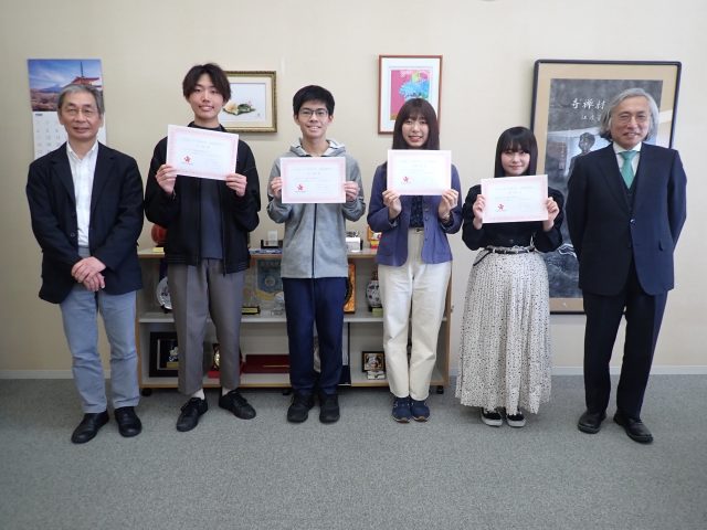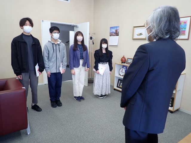 令和3年4月27日(火)、学部2年生の成績優秀者4名(峪 悠也さん・佐藤 涼香さん・田原 和真さん・三橋 奈桜さん)に対し、学長室にて22世紀奨学金の授与式を挙行しました。