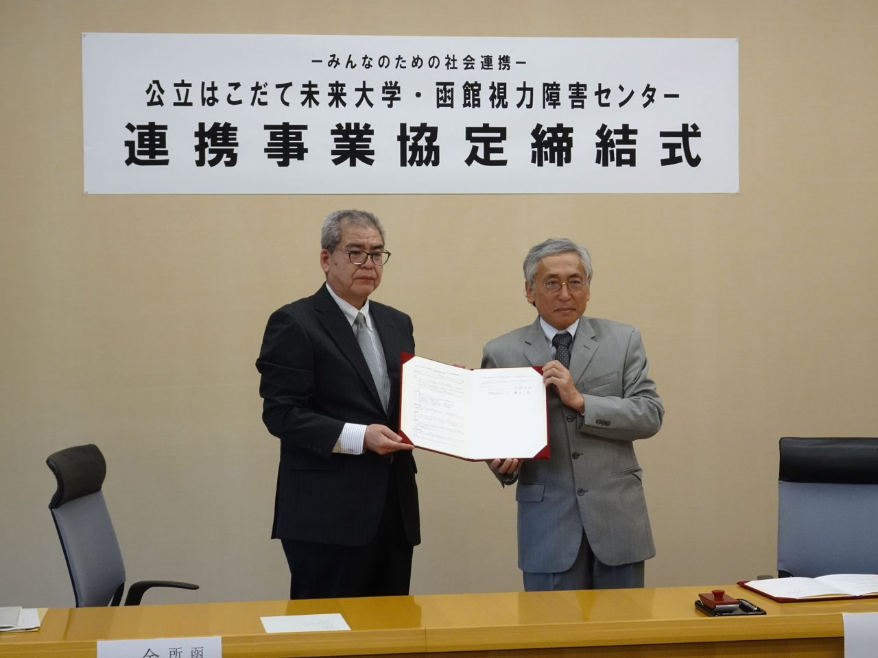 令和3年8月20日、本学と函館視力障害センターとのあいだで、連携事業に関する協定を締結いたしました。同日、締結式が本学で行われ、函館視力障害センターの金子一夫所長と本学の片桐恭弘学長が、協定書へのサインを取り交わしました。