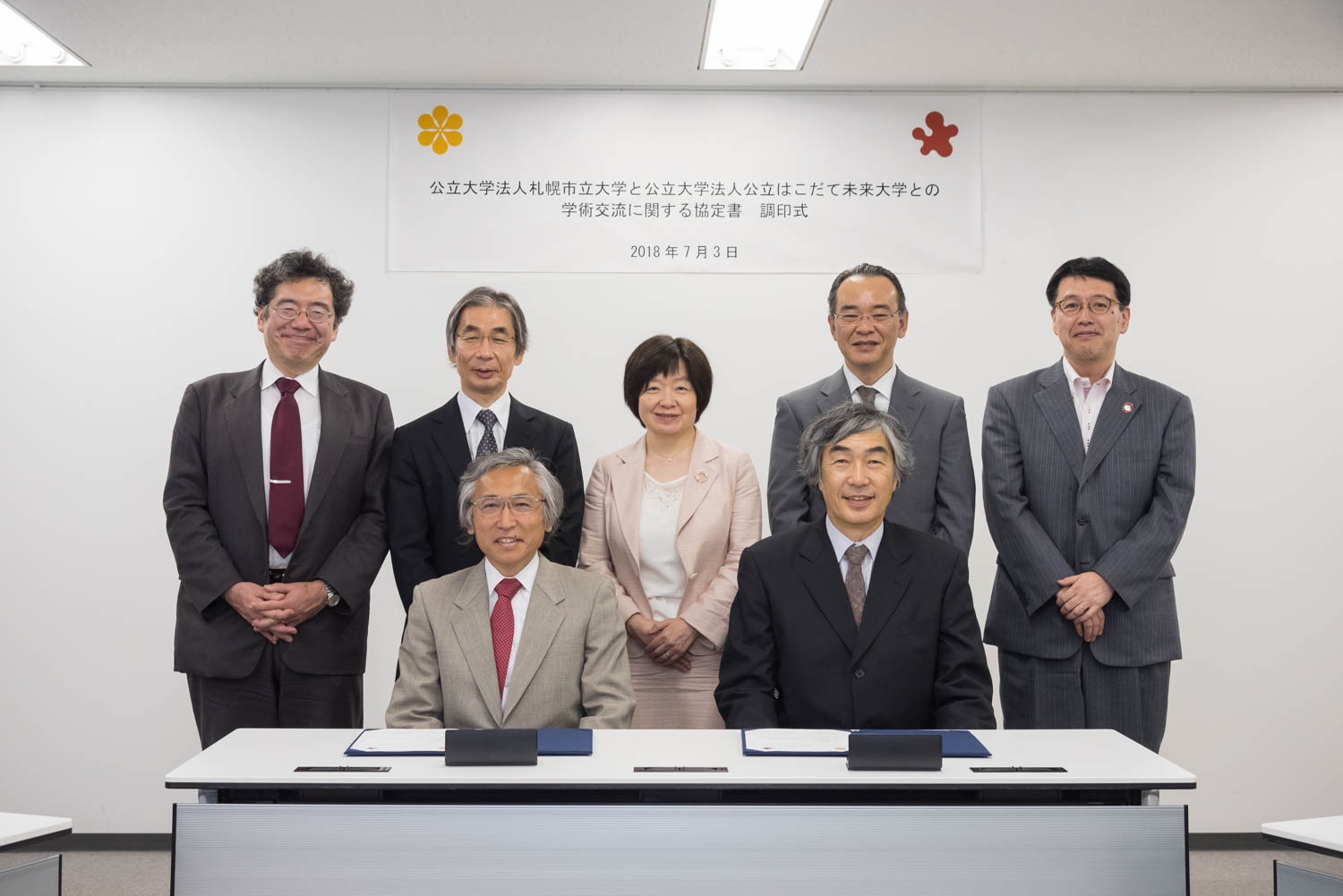 調印式は、札幌市立大学サテライトキャンパスで行われ、本学から片桐学長、松原副理事長、川嶋副学長が、札幌市立大学からは中島学長、樋之津副学長、細谷学部長、川上事務局長が出席しました。