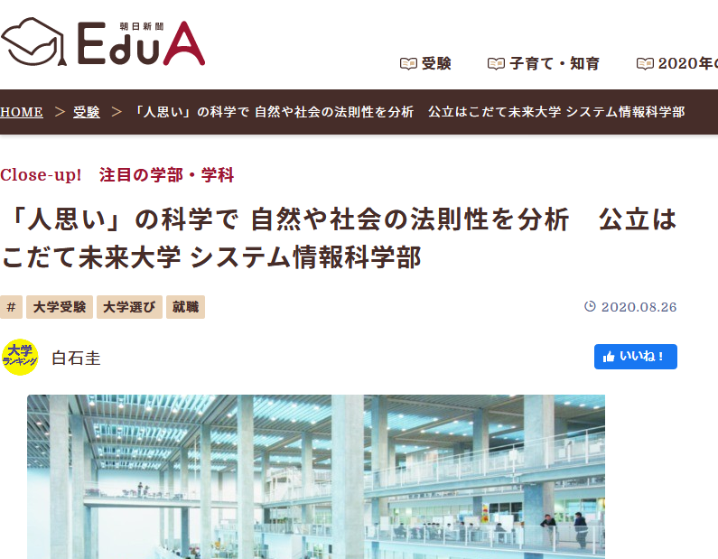 メディア 2020-08-26 今、本学システム情報科学部が注目されています 朝日新聞EduA(エデュア)に掲載 教育媒体 朝日新聞EduA(エデュア)の注目の学部・学科の紹介で、佐藤直行 複雑系知能学科長と、複雑系コース4年の山崎旅詩さんのインタビュー記事が掲載されました。 朝日新聞EduA(エデュア)「人思い」の科学で 自然や社会の法則性を分析