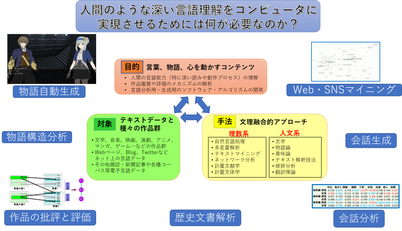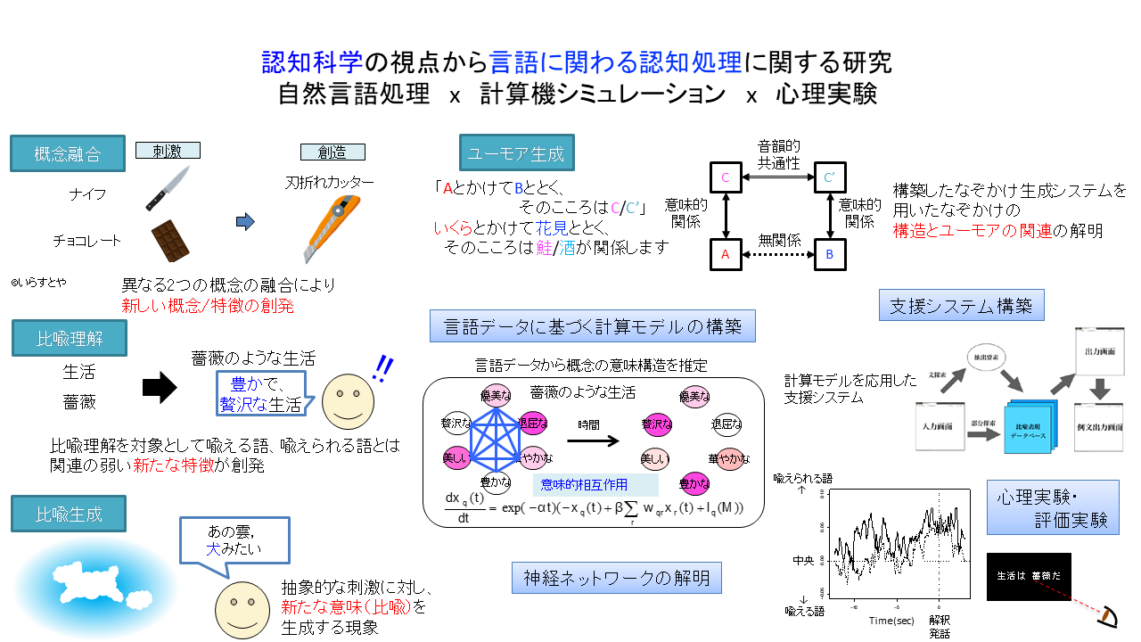 認知科学の視点から、言語に関わる認知処理について研究しています。異なる「概念」が融合することでおこる創造、言語表現を対象とした新しい意味の創発などを対象とし、自然言語処理、計算機シミュレーション、心理実験などを用いて研究を進めています。