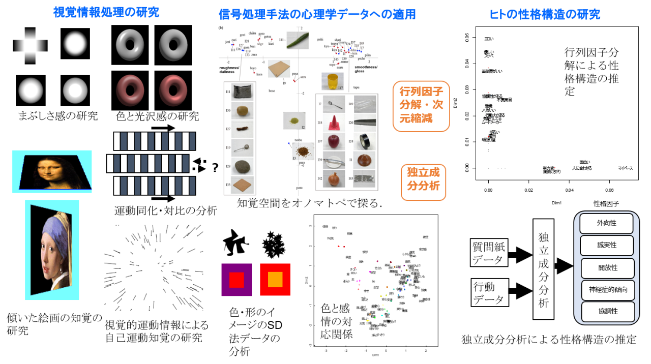 視覚に関する情報処理について研究しています。特に、動いているものをどのようにヒトの視覚システムが処理しているのかについて研究してきました。最近は、色や形の印象、オノマトペ、ヒトの性格の構造、折り紙、心理学のデータ解析についても興味を持っており、研究しています。