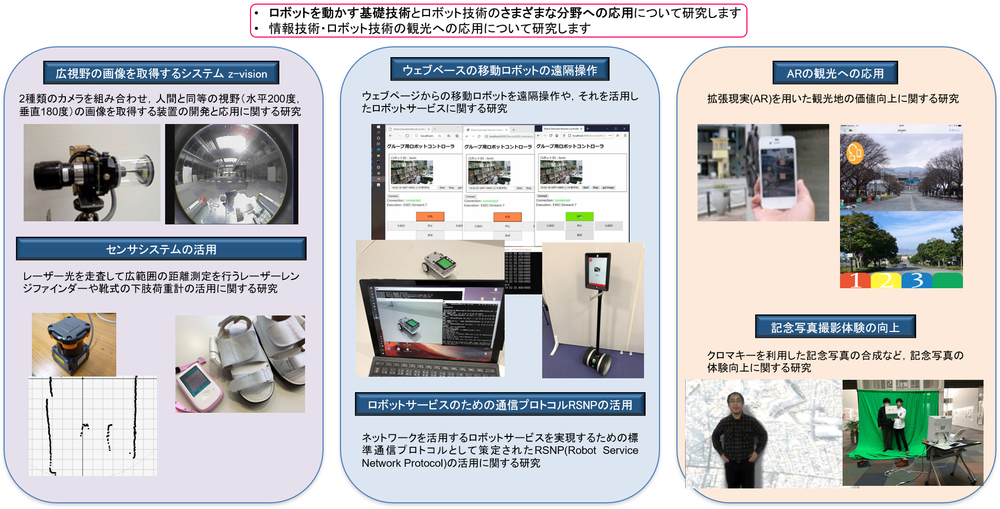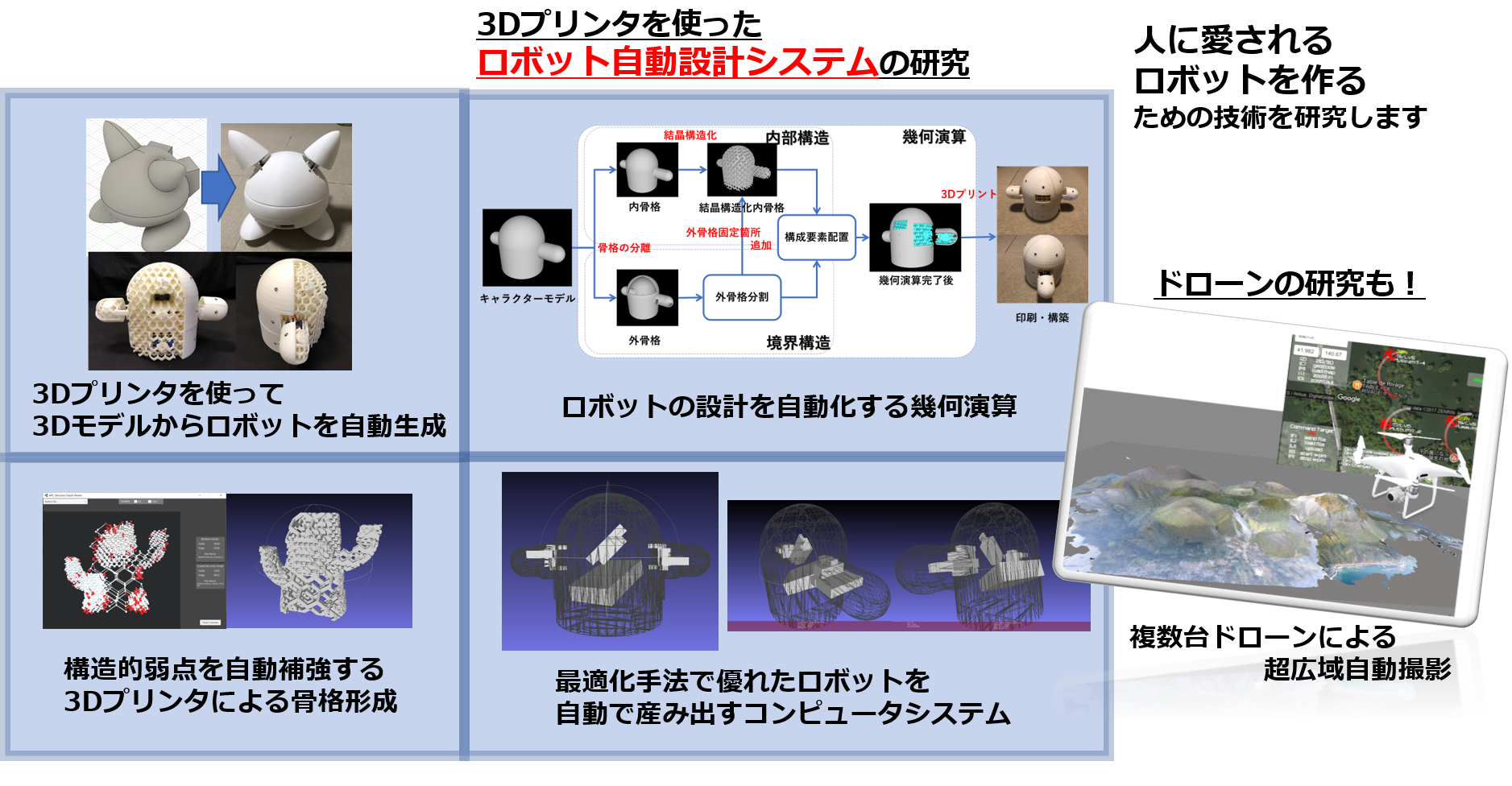 情報科学の観点から捉え、魅力あふれるロボットの開発を目指している。