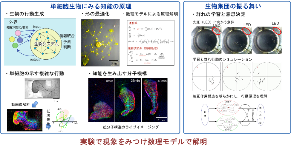 具体的には巨大な単細胞生物である真正粘菌を対象に、原始的な知能を生み出す機構の解明を試みています。粘菌は情報中枢のない典型的な自律分散システムですが、その細胞運動を司る細胞骨格分子の可視化から行動決定まで階層の異なる現象の実験と数理モデルの構築を通じて、その情報処理機構を調べています、また、同様に自律分散システムと考えられている魚の群れにおいて、個々の学習と個体間の情報伝達を通じて生成される群れ行動から、群れの知能を調べています。
