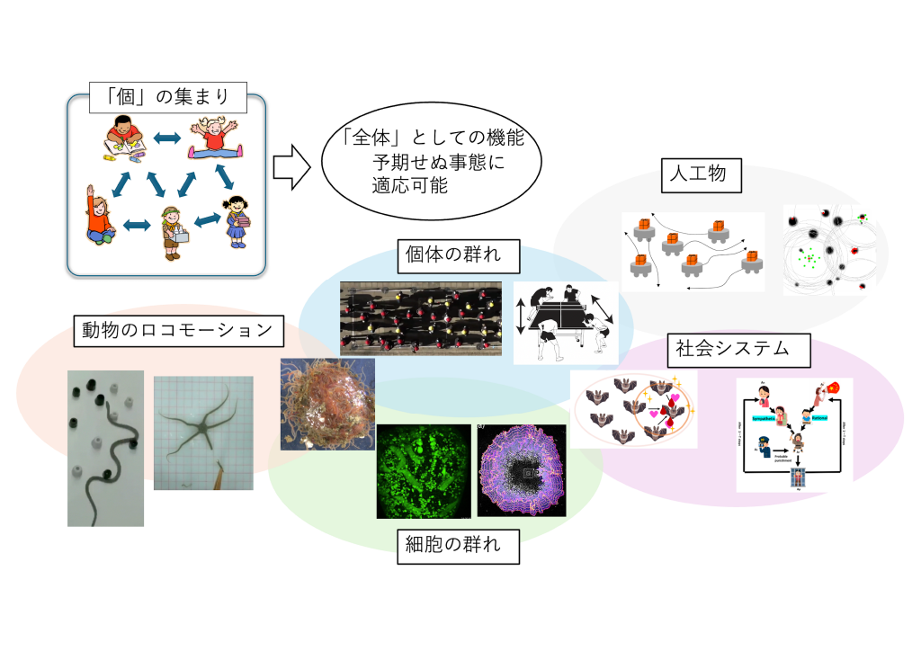 多数の要素の集合が、自己組織的に作り上げる多様な秩序だった運動や、それによる情報処理能力について研究を行っています。