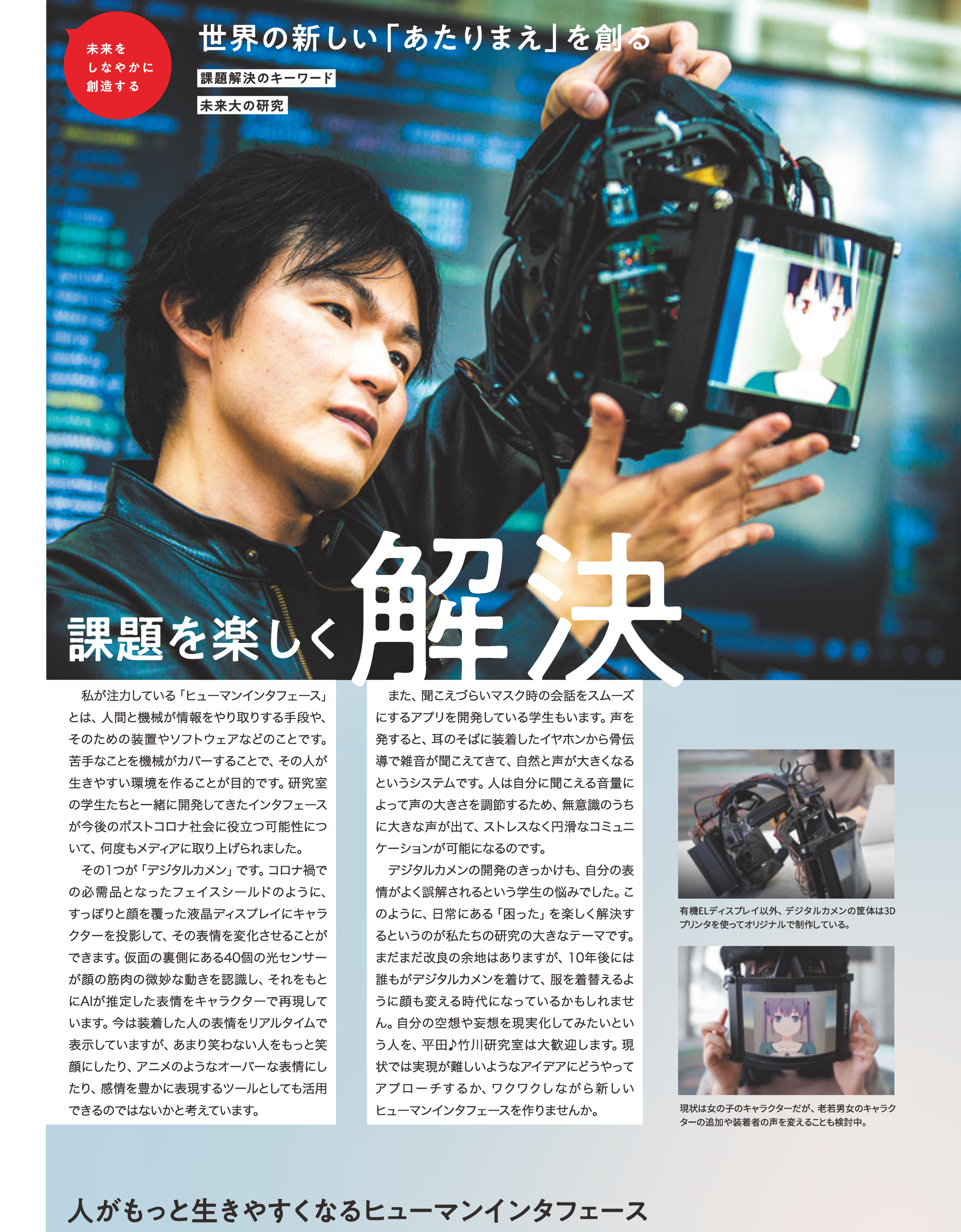 我々の生活の質や人の能力を、ウェアラブルコンピューティングを活用して向上させる研究をしています。特に音を用いたシステムを中心に、ヒューマンコンピュータインタラクション、センシング、人間行動認識、人間拡張、情報提示などをキーワードとして研究を行っています。